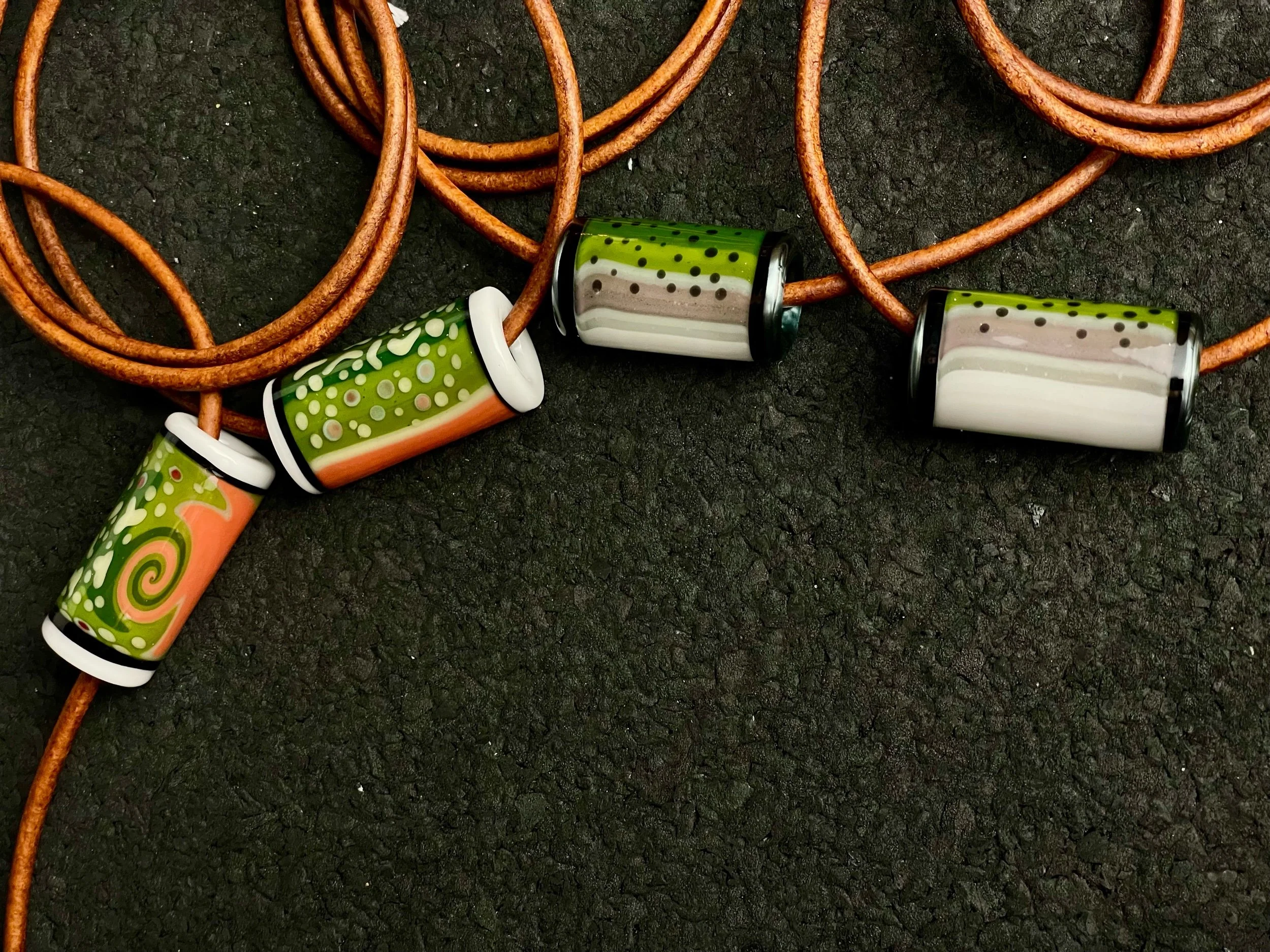 Shop › Fish Beads Image 1 of 1 Fish Beads from $60.00 Made by 603 glass Color: Select Color Green black spots (all way right) Green black spots (right) Green white spots Wig wag fishy bead (all way left) Quantity: Add To Cart Added! Made by 603 glass